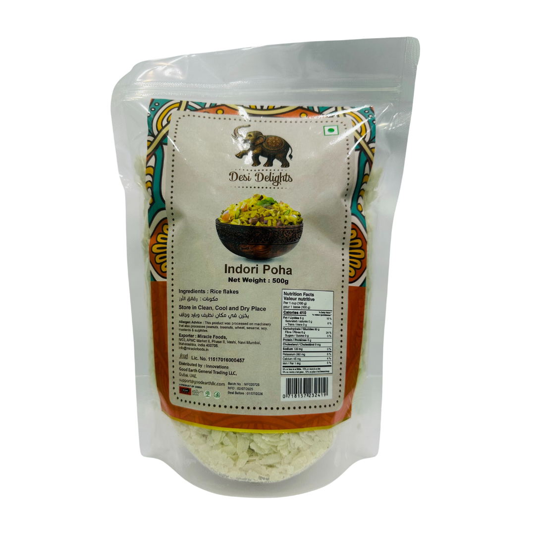 Desi Delights Indori Poha 500g is made from 100% Flattened Rice, finely milled to preserve nutrition and authentic taste. Rich in fibre and essential nutrients, this flour is ideal for making traditional Indian rotis, dosas, bhakris, and healthy baked dishes. Clean, pure, and unadulterated — crafted for the modern kitchen with traditional goodness.100% Flattened Rice. Authentic and naturally gluten-free Indori Poha 500g, perfect for wholesome Indian recipes and daily cooking.
