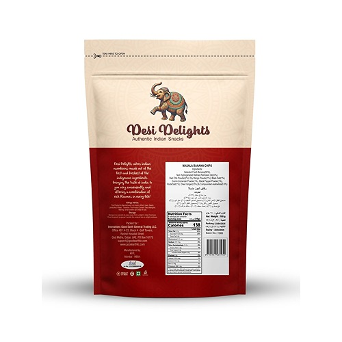 Desi Delights Masala Banana Chips 180g is made from Selected Fresh Bananas, Non Hydrogenated Refined Palmolein Oi, Red Chili Powder, Dry Mango Powder, Black Salt, Cumin-Coriander Powder, Black Pepper Powder, Rock Salt, Dried Ginger & Compounded Asafoetida., finely milled to preserve nutrition and authentic taste. Rich in fibre and essential nutrients, this flour is ideal for making traditional Indian rotis, dosas, bhakris, and healthy baked dishes. Clean, pure, and unadulterated — crafted for the modern kitchen with traditional goodness.